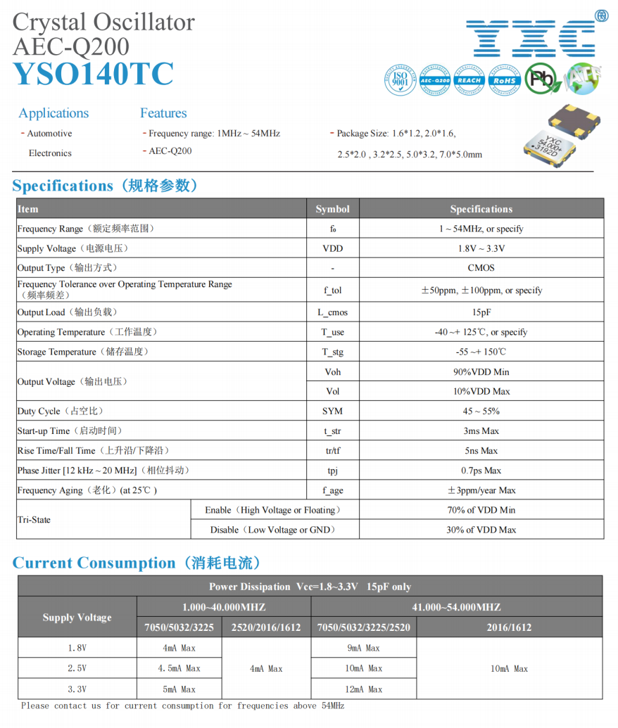 YXC晶振YSO140TC系列,频率为1~54MHz,工作温度-40~+125℃,封装尺寸多种可选:1.6 x 1.2/2.0 x 1.6/2.5 x 2.0/3.2 x 2.5/5.0 x 3.2/7.0 x 5.0,以下为YSO140TC系列规格书。