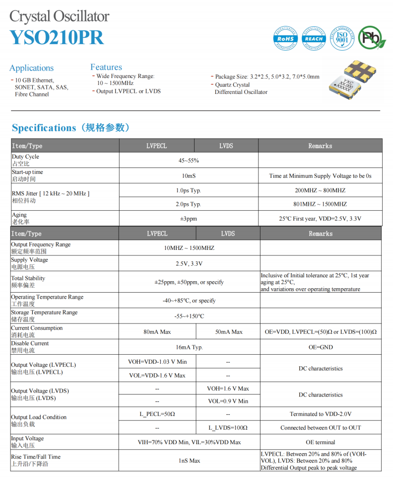YXC晶振YSO210PR系列,频率为50MHz,总频差±50PPM,以下为YSO210PR系列规格书。