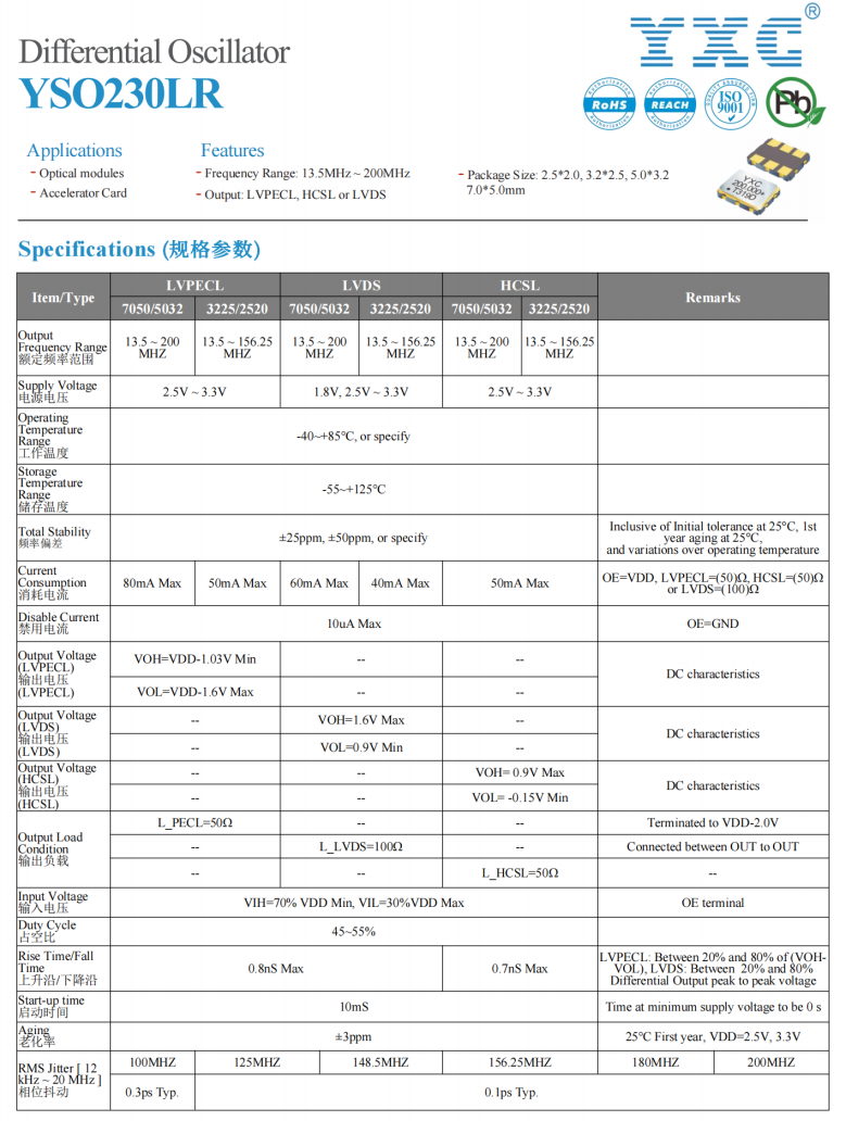 针对客户需求YXC推出的石英差分振荡器YSO230LR系列中OB2LIC112-156.25M这颗料,以下为OB2LIC112-156.25M的典型参数在光模块中的应用特点: